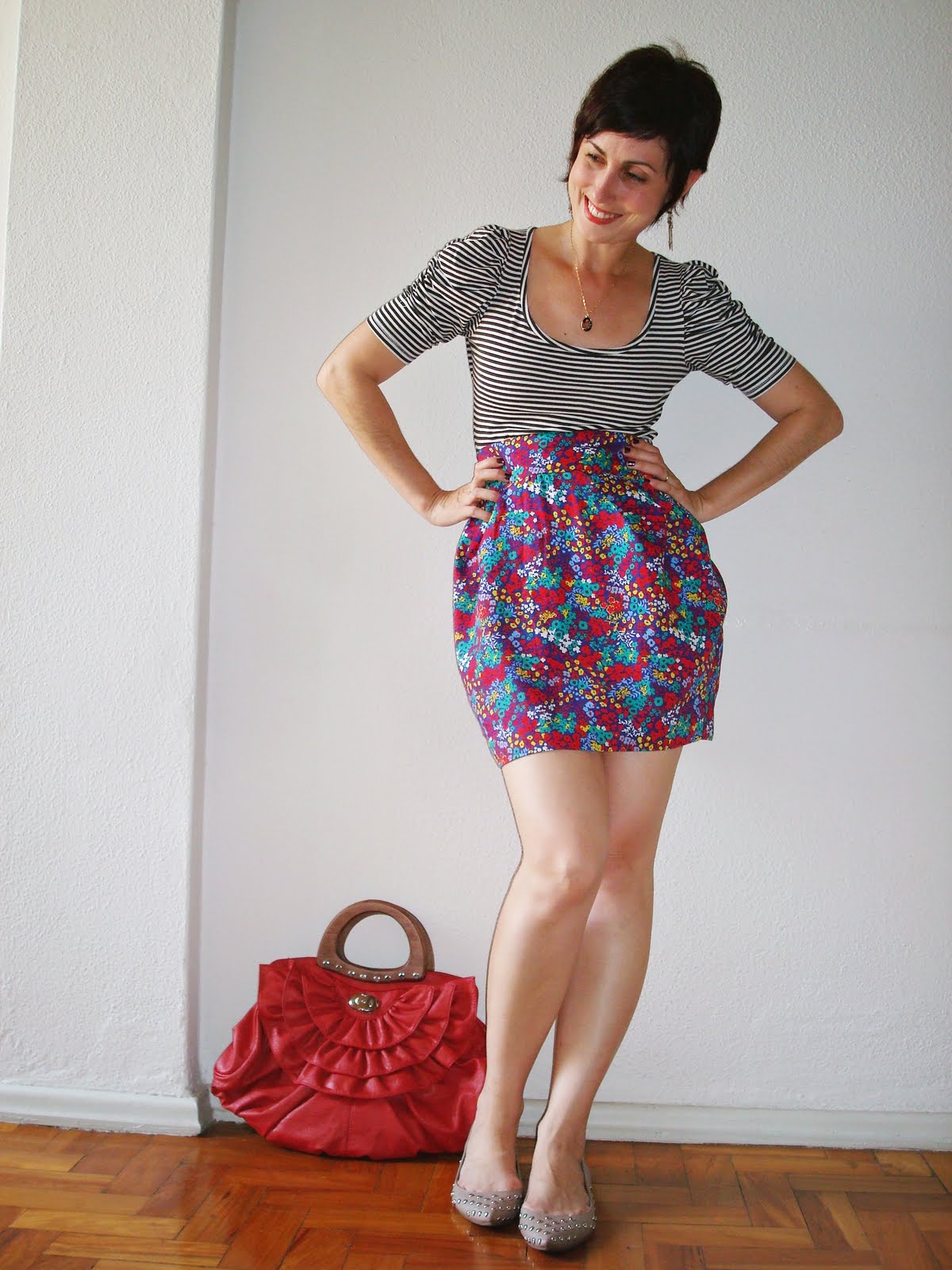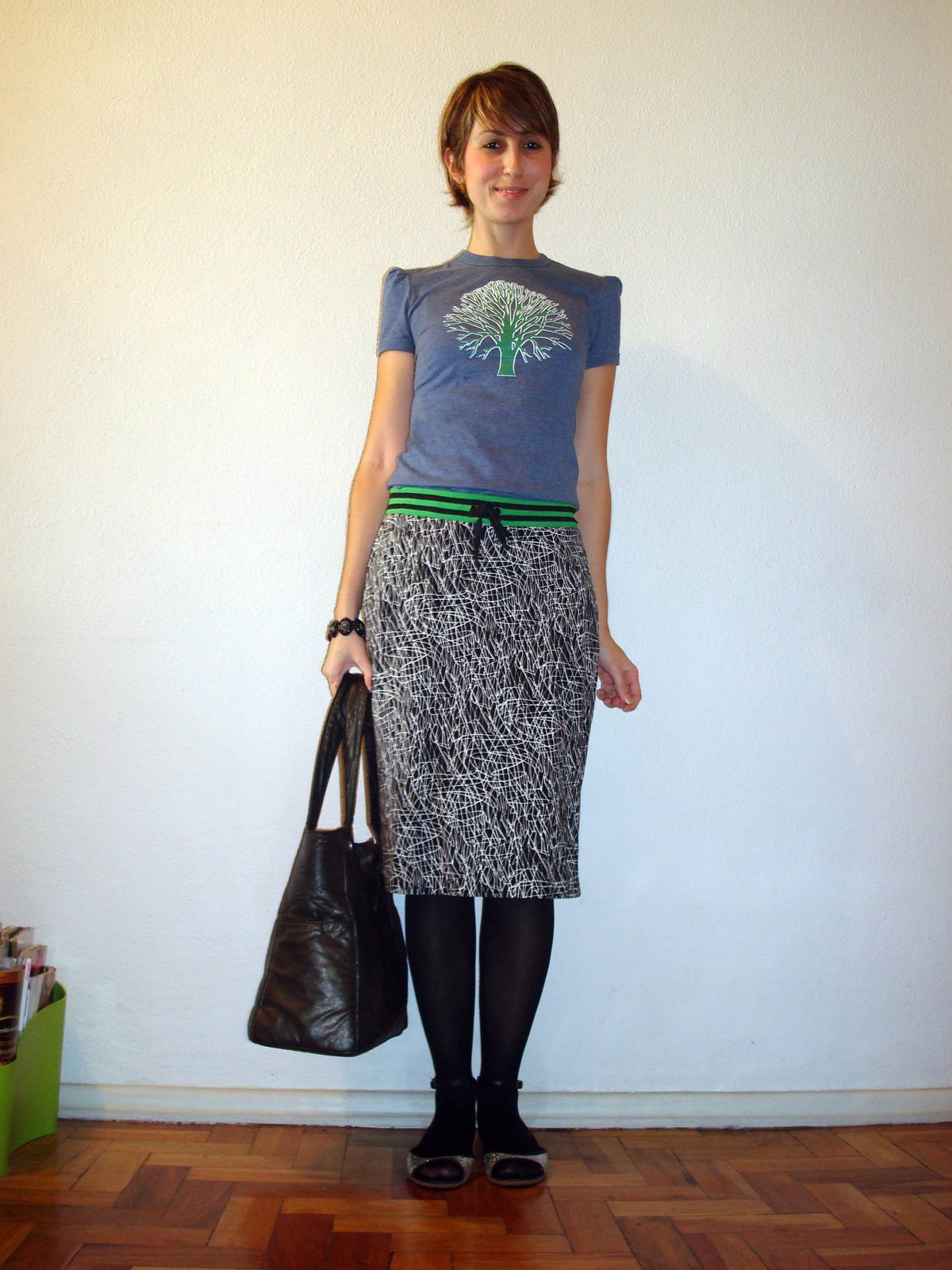 Além de magricelinha (prefiro bem mais meu manequim hoje), eu estava com essas luzes douradas e equivocadas no cabelo, me deixando apagada, rs! Mas vamos focar no look: eu gosto, heim? Usaria, acho que só trocaria essa meia calça e sapatilha por um tênis. Adoro as cores, o grafismo da saia, a proposta com a camiseta. 🙂