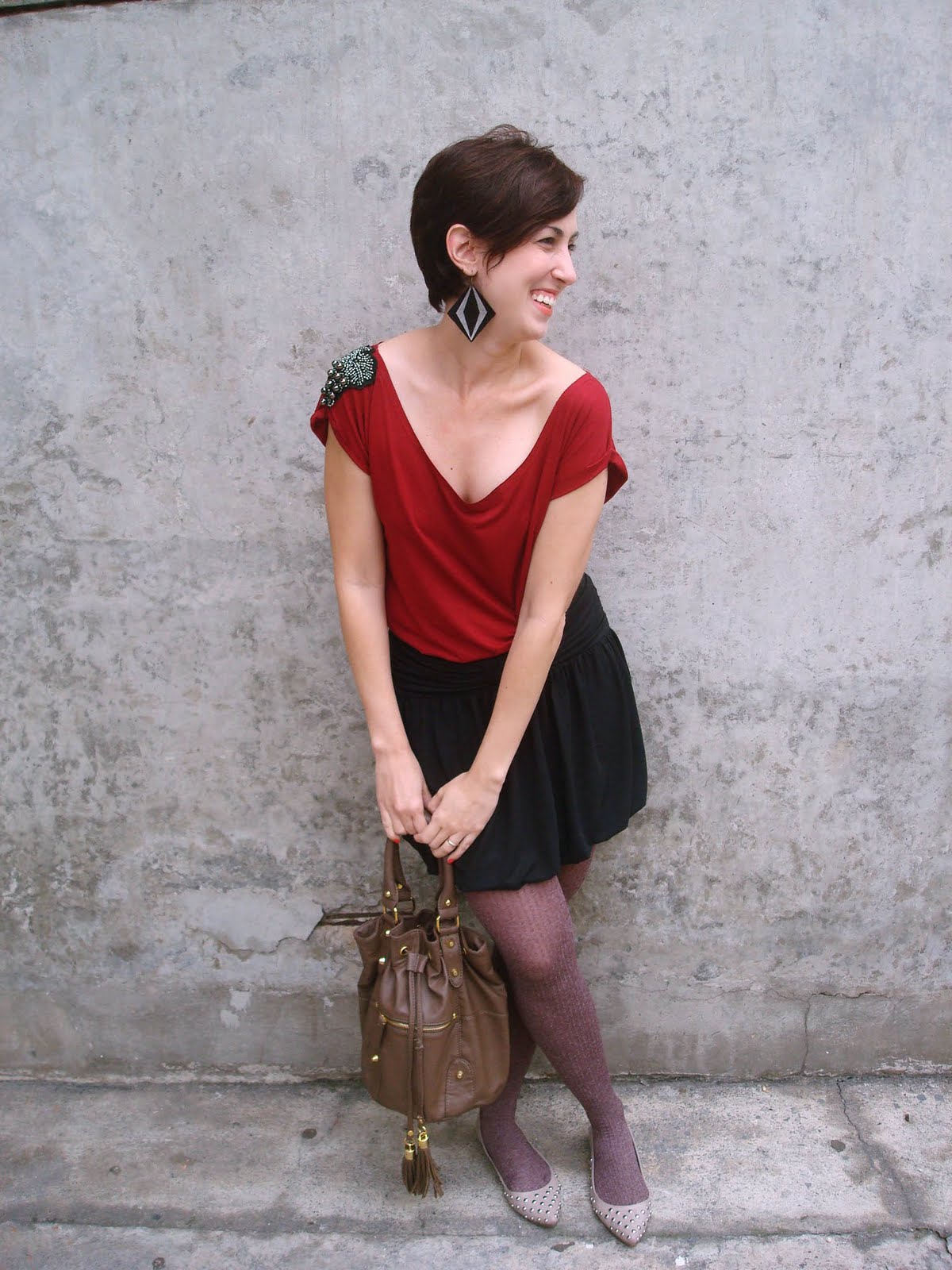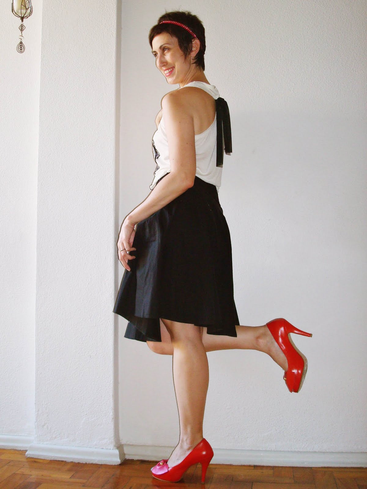 Em 2009, quando eu ainda fotografava da minha casa antiga, haha, bem no improviso, e eu nem usava maquiagem. A saia tinha uma estrutura e eu usaria de novo, mas obviamente não com esse conjunto de salto vermelho e regata.