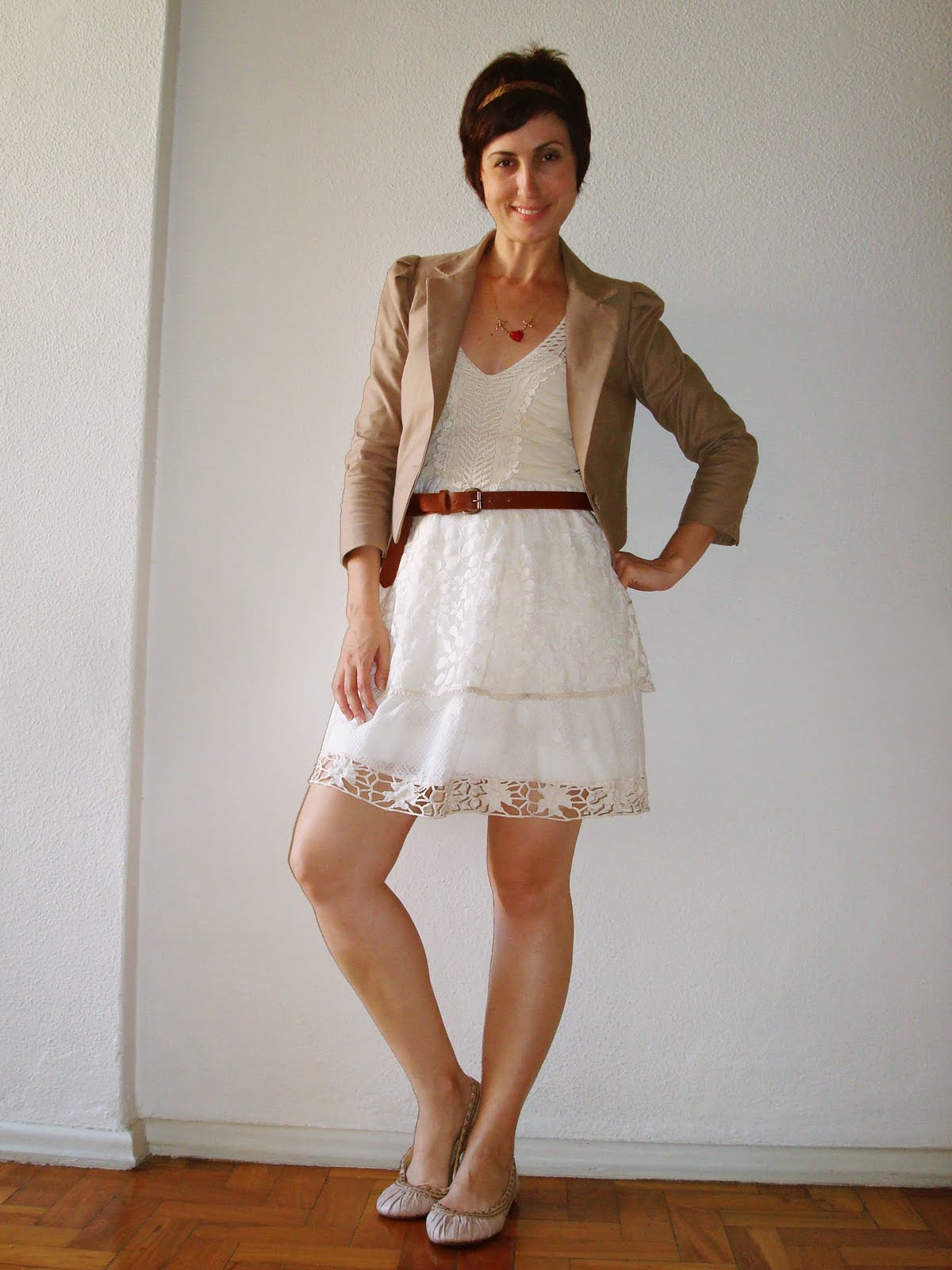 Esse é outro look que não desgosto, usei muito esse vestido que, apesar de ter renda, era mais diferentão. Eu adorava também esse blazer curtinho da coleção da maria bonita extra para C&A, mas gente, ainda tô muito romântica nos detalhes, como no colar, ombros bufantes, sapatilha rosê e de bico redondo.