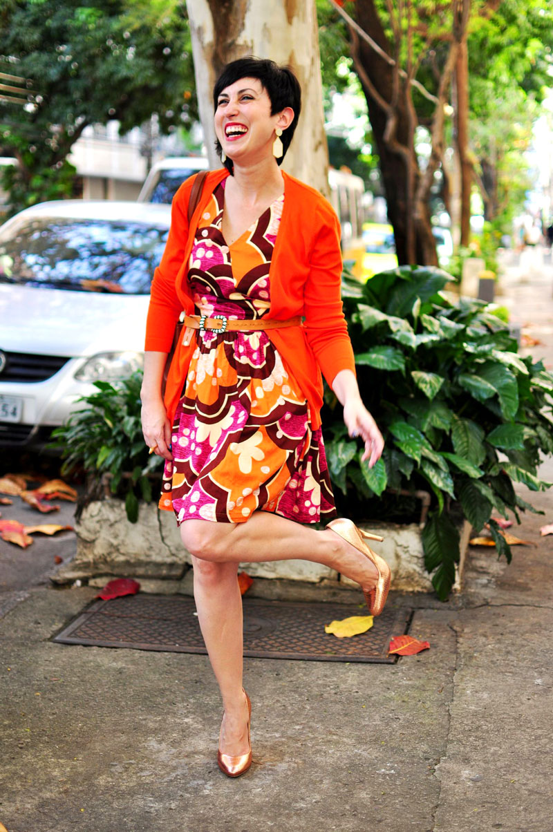 Gosto principalmente da estampa vibrante e dos detalhes nos ombros, adorno essencial por conta do meu tipo físico.  Como à noite tem esfriado, joguei esse cardigan laranjão pra acompanhar as suas cores e compus com o cinto por cima para variar um pouco e tentar acinturar mais a silhueta. Taí! Preciso mesmo dar mais chances a ele.