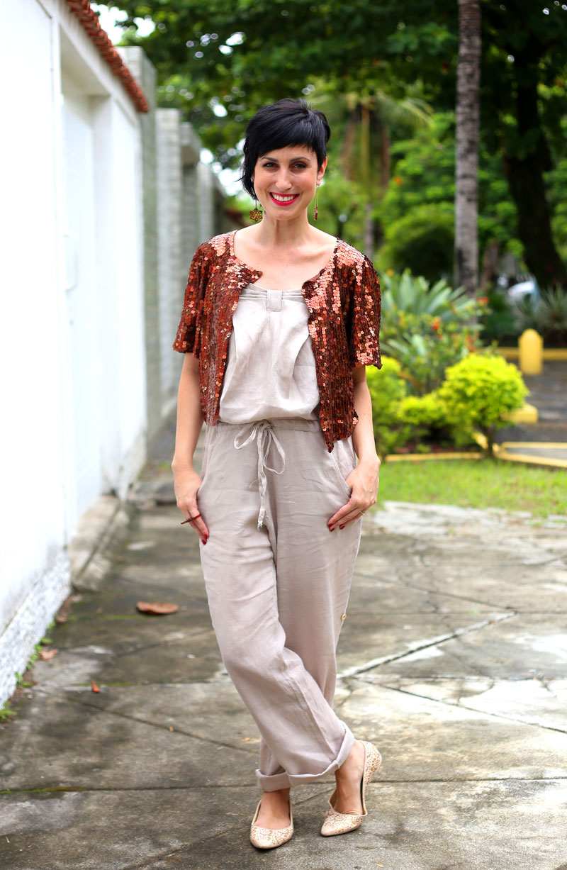Hoje to toda bronze/areia, viram? Deu vontade de usar essas cores da elegância, hahaha! Esse macacão de linho lembra demais a minha vó: tomei gosto pelo tecido por causa dela, que tinha macacões e saias do material e dizia que não existia coisa mais chic que linho amassado. Concordo, claro.