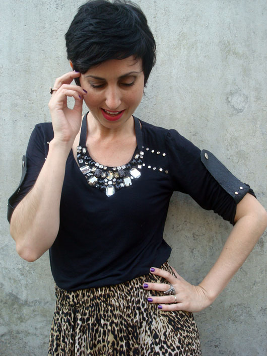 Pensando previamente em um look, eu lembrei o quanto de estampa de oncinha eu tenho no armário. Tá certo que eu sempre gostei da estampa (tenho sapato de oncinha de 6 anos atrás), mas esse modismo repentino me ajudou a colecionar alguns itens a mais. Aí lembrei que sempre rolou essa discussão sobre moda x modismos e o quanto esse look que eu havia pensado pra hoje era total fashion victim… resolvi usar de propósito! Contabiliza comigo, gente: saia longa de oncinha + ankle boot + camisa com tachas + maxi colar. É ou nã1234stereótipo perfeito? hahaha!
