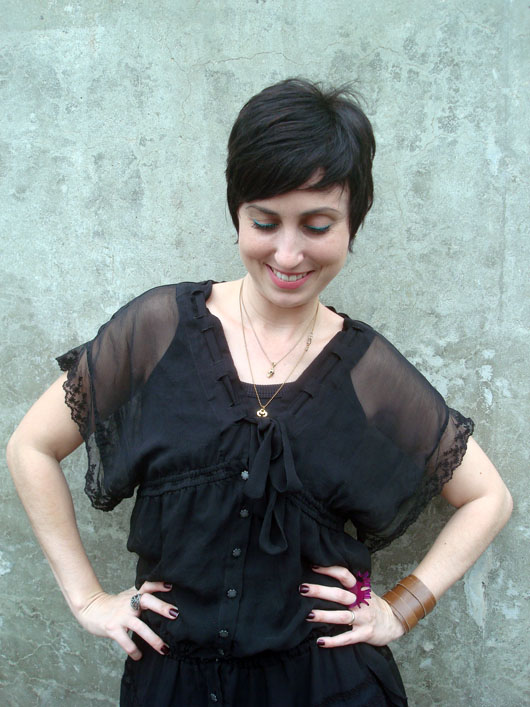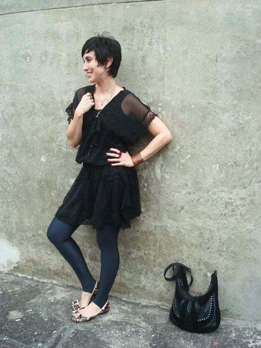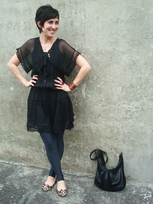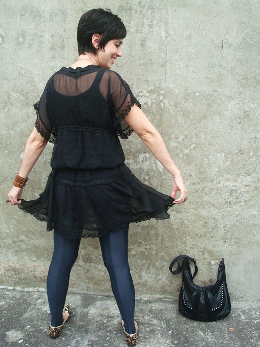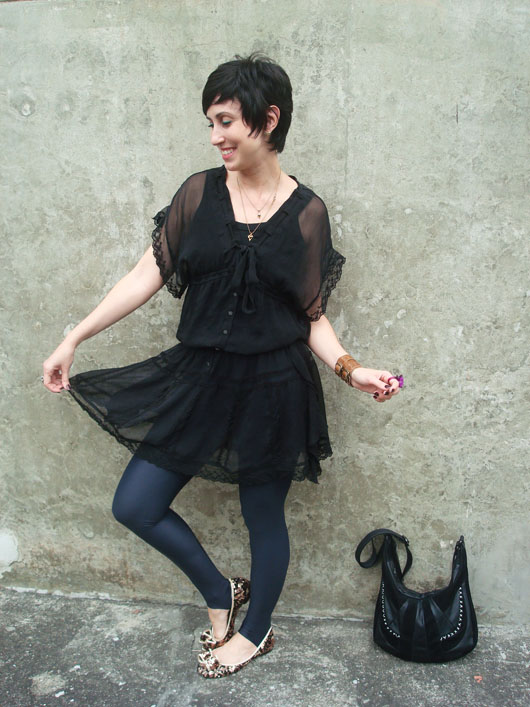 Usar o vestido preto sem o forro. Eu estava há dias com essa ideia na cabeça, até que hoje resolvi colocá-la em prática. O vestido transparente fez as vezes de uma túnica e por baixo uma simples camiseta com legging trataram de deixar a produção “usável”. Claro que esse tipo de combinação pode ficar bem perigosa por conta da transparência, mas acho que o modelo romântico do vestido quebrou um pouco isso. Mas chamou bastante atenção por onde eu andava, fato!