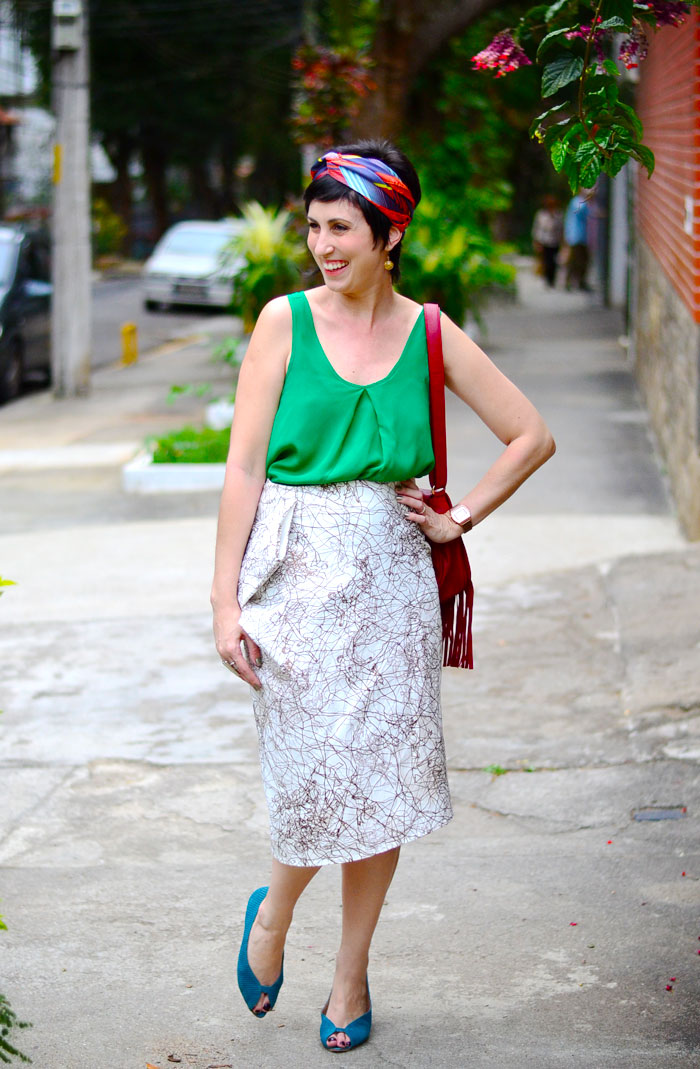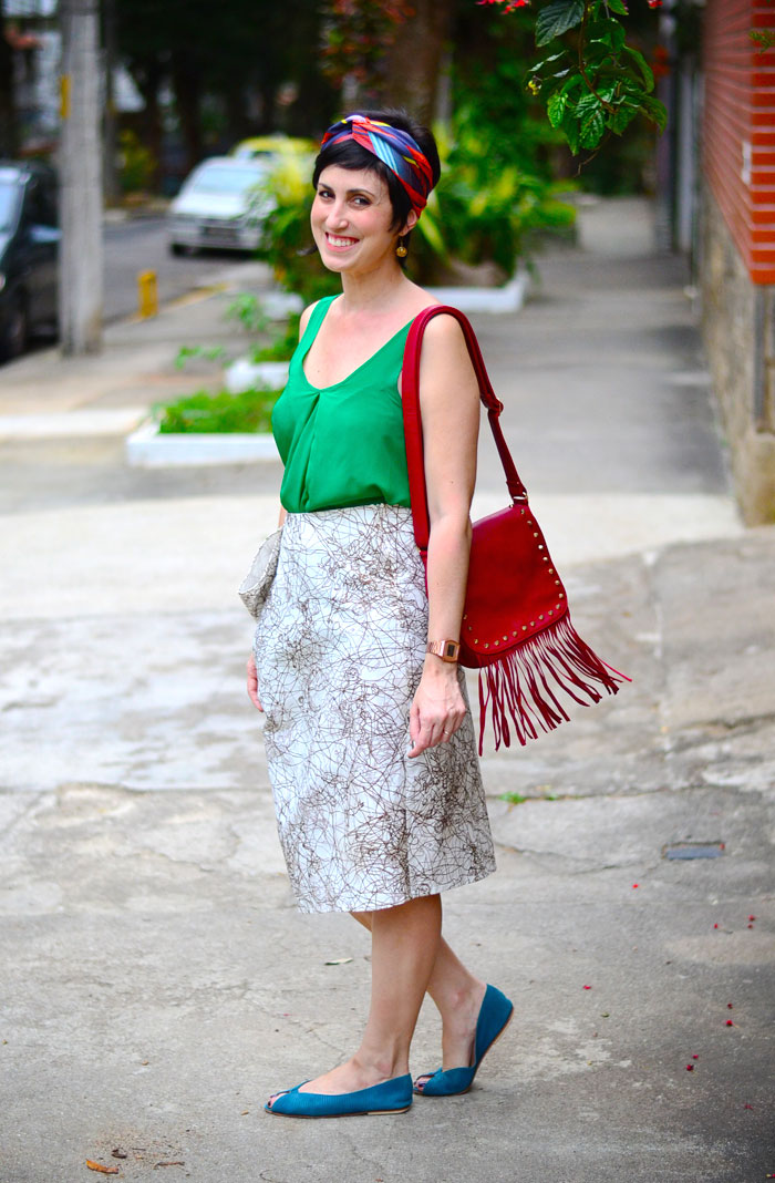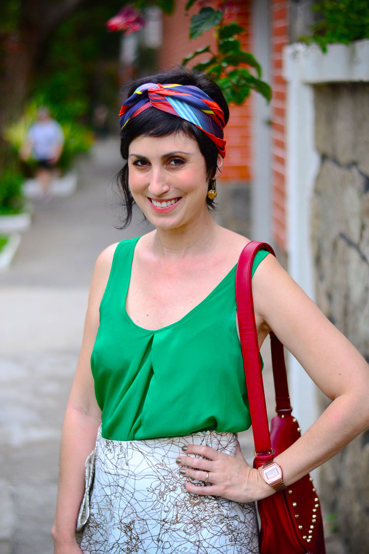 O lenço foi o ponto de partida para os dois looks. O primeiro eu usei com short jeans, mas hoje esfriou, eu repeti o look e apelei para uma calça vermelha, justamente por ter alguma cor que estivesse também no turbante.