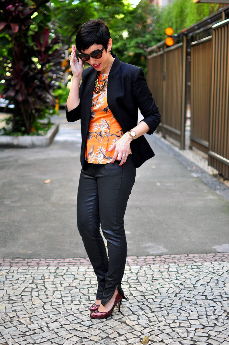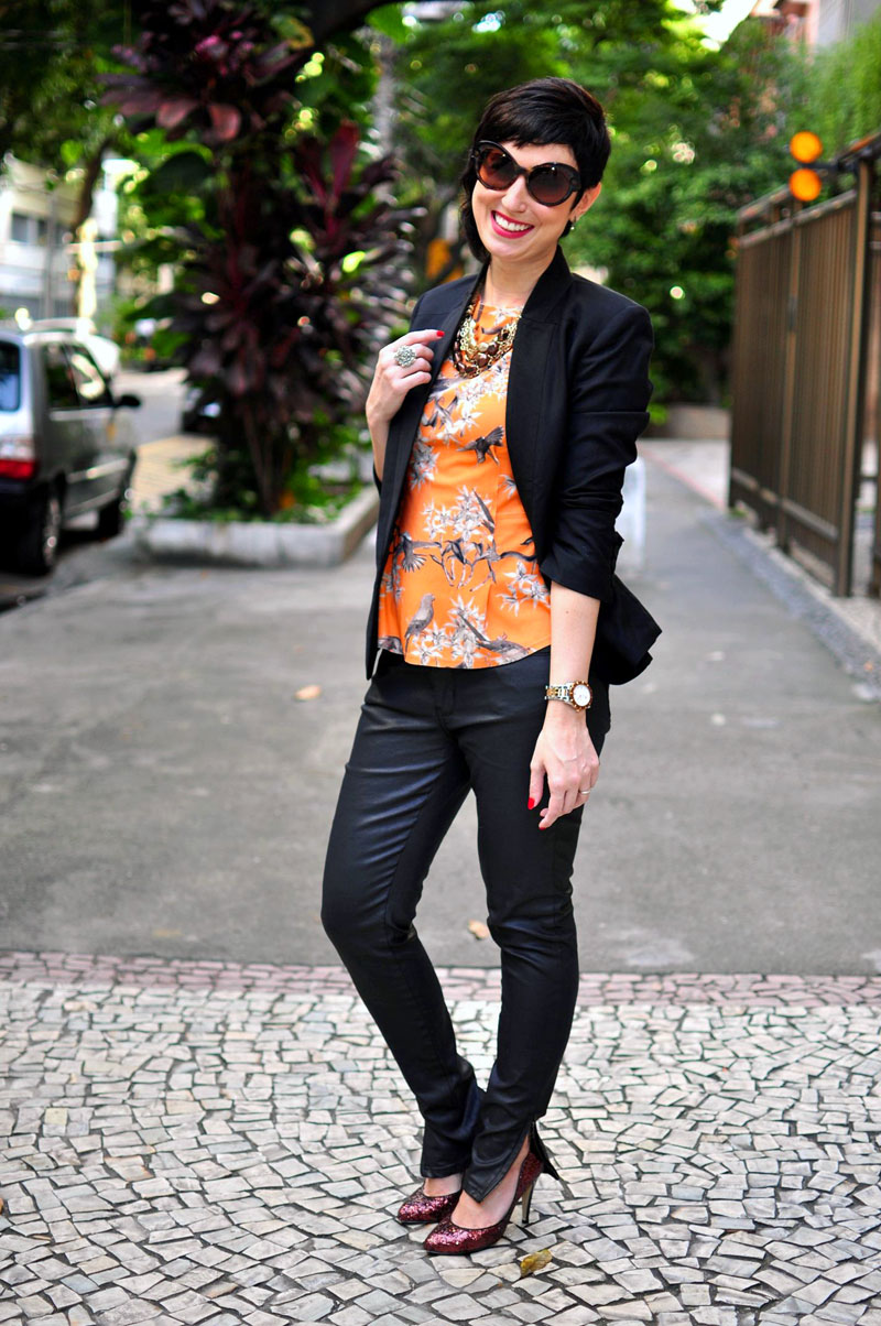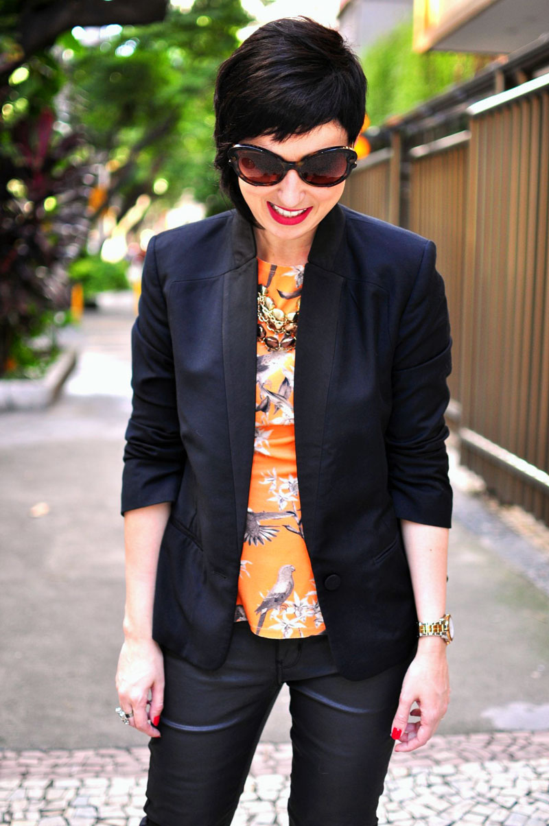 Por isso fui na minha produção curingona de sempre! Blusa, calça e blazer. Mas o pulo do gato são quais peças combinar! Por exemplo, a calça é um black jeans, que dá um ar mais formal que jeans mais claro. A blusa peplum laranja com estamp1234arte descontraída do look e aí, PÁ, jogo um blazer por cima para o look virar look de trabalho. Saca só o poder transformador e formalizador de um blazer, galera!