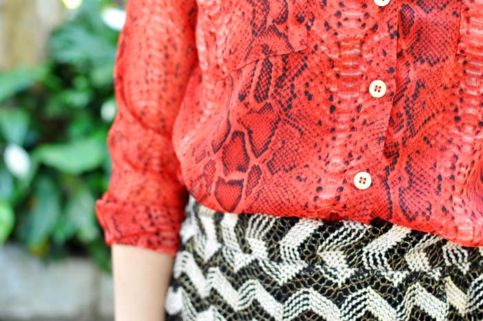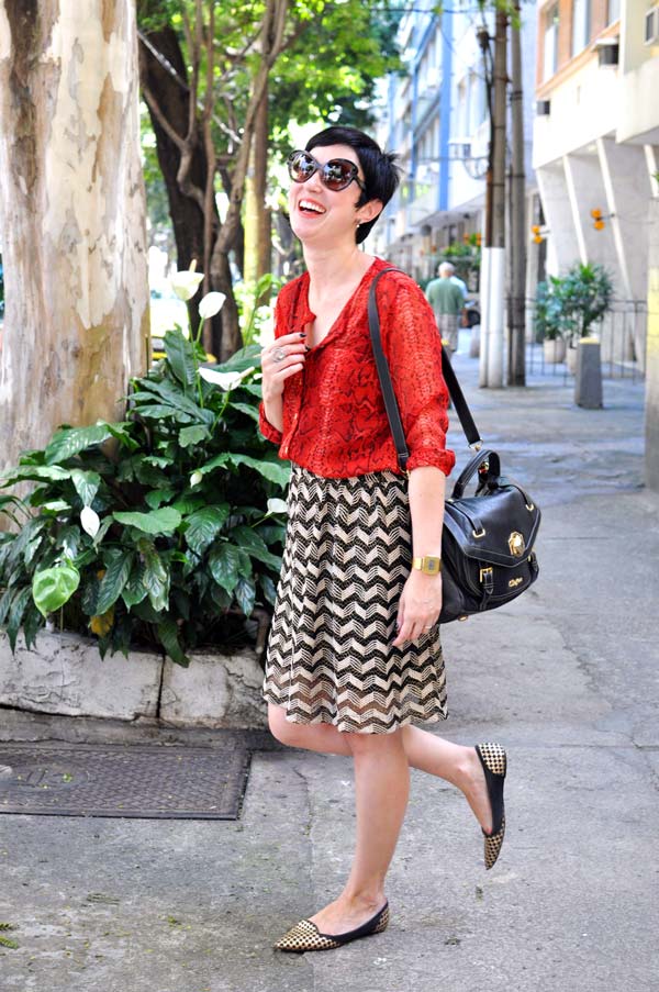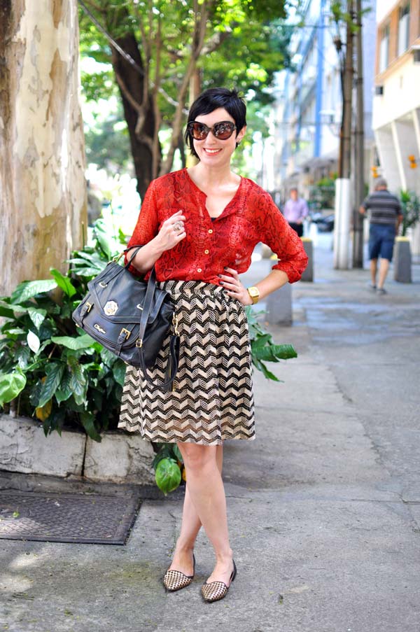 Esse eu usei para fazer compras com uma cliente de consultoria. Quando eu quero ficar arrumada e fresquinha, apelo sempre para essa saia. Nesse dia resolvi misturar padronagens, daí pensei automaticamente na camisa com estampa de cobra e voilá!