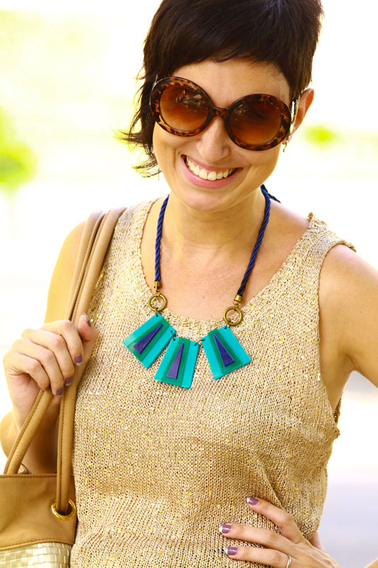 E o visual todo acabou entrando nessa vibe: a bols1234apato também tem dourado e brilhos. Adoro essa textura da trama da blusa, com paetês bordados, é uma peça bem fresquinha e que faz a maior vista, sem que eu precise inventar muito no look. O colar art deco nesses tons lindoooos é da coleção nova das minhas amigas da Zellig que eu ganhei de natal! Aliás, montei o look a partir dele, o acrílico azul acabou me inspirando para usar essa saia, que é uma das peças mais antiguinhas do meu guarda-roupa! Ela andou encostadinha durante algum tempo no meu armário, mas consegui redescobri-la antes de pensar em me desfazer dela. Nada como deixar a cisma de lado e usar a peça na prática!
