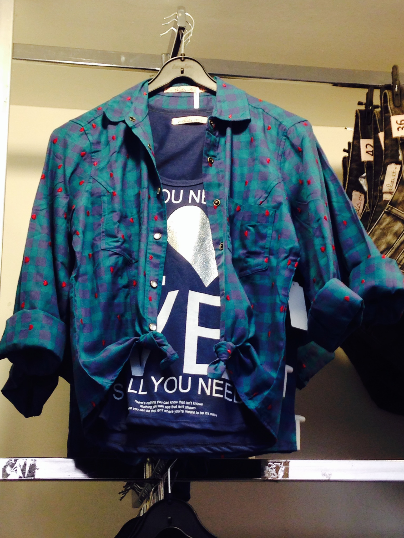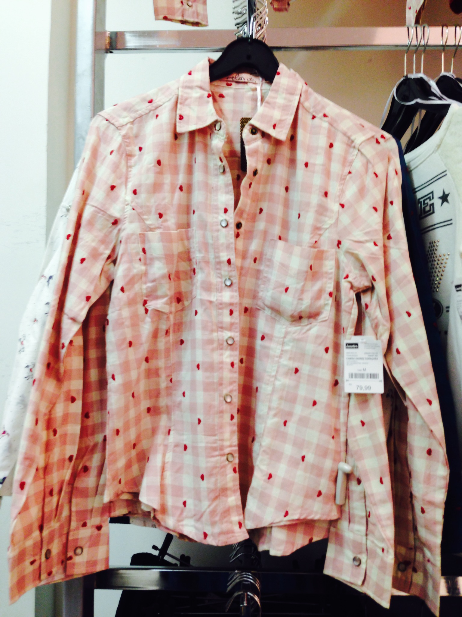 E mais uma dica que vi nas araras há um tempo e depois consegui arrematar antes dessas fotos, no início da liqui: essas camisas xadrez com corações bordados foram remarcadas de 79,90 pra 19,90 na loja do Shopping Tijuca – mas dependendo da quantidade em cada loja esse preço pode variar, na loja virtual está 49,99, ainda assim um bom preço! No site tem da azul e da rosa. Eu, que não amo xadrez, fiquei super bem nesse azul e diante desse precinho fui obrigada a levar…hahahah #prioridades
