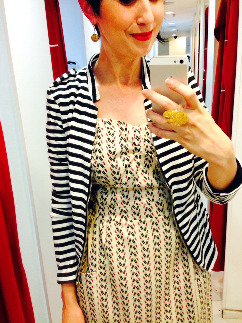 O vestido tem a mesma estampa (de batons) da blusa que te mandei no Achadinhos e saiu por 30 reais, também na Leader. Gostei do blazer de listras.