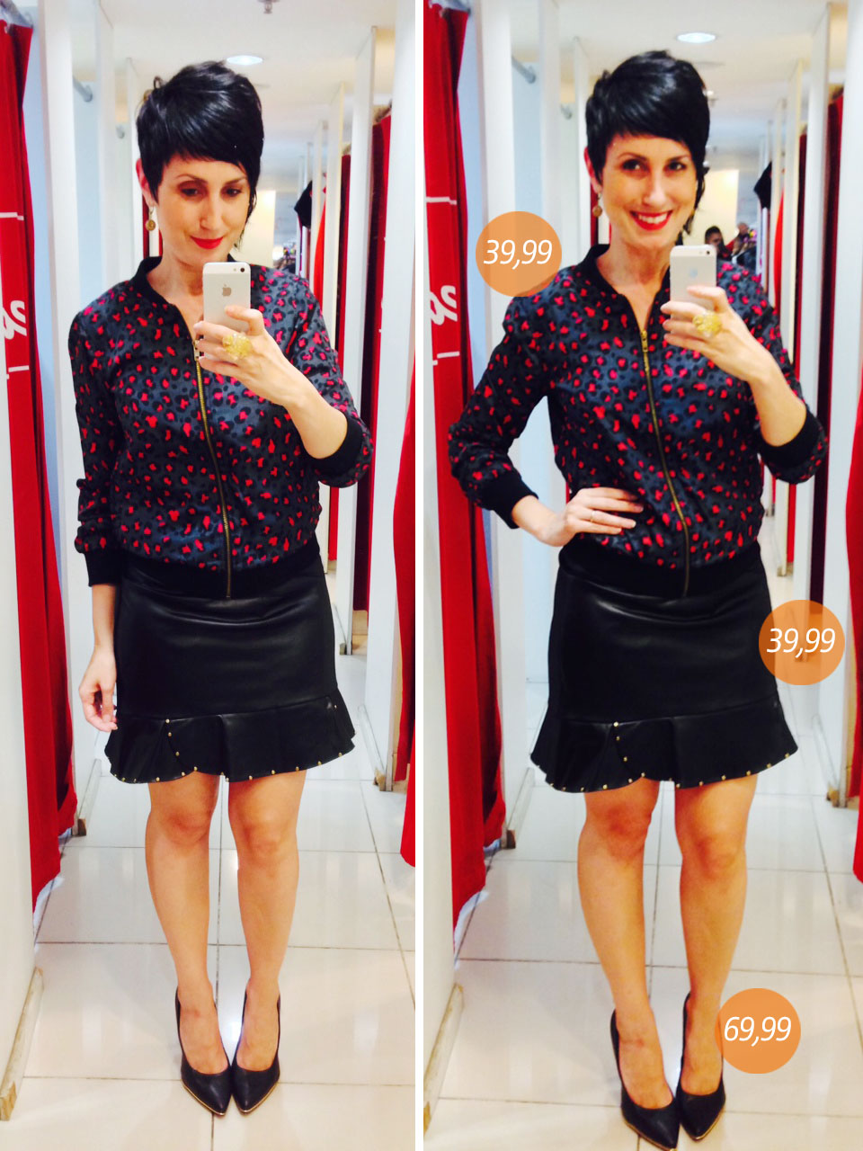 Essa jaquetinha bomber de oncinha modernosa já apareceu nos achadinhos das leitoras e eu não resisti quando a vi! Por 39,99, super-mega-hiper vale a pena! Para contrastar com o estilo esportivo dela escolhi essa saia que é bem parecida com uma que eu tenho, mas de tecidinho cirré, bem confortável, super feminina, também por 39,99! Ah, e o scarpin preto que figura esses looks já apareceu nesse post, mas agora vai ser dar bem quem correr atrás dele: sai a 69,99!