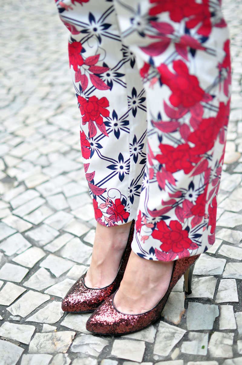 Depois que eu apareci no blog com essa calça estampada que já tinha esgotado no site, a AREMO entrou em contato comigo para mostrar a sua variação, com detalhes florais vermelhos e mais ajustada ao corpo! O melhor dessa calça é que ela tem elastano, então o tamanho 38, qu1234eu número, me vestiu perfeitamente.