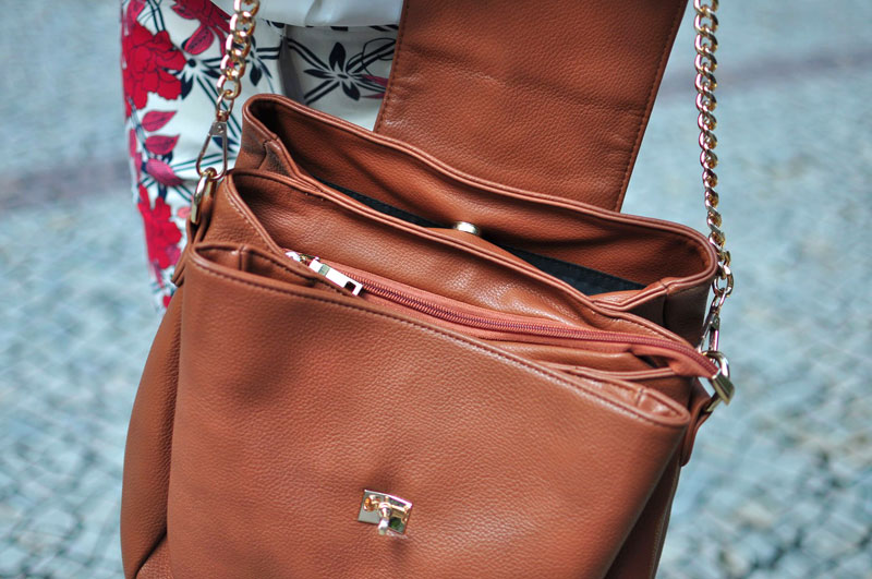 A bolsa é outro acessório que fez a diferença, antes eu só tinha aquela tote bag grandona. Essa tem um tamanho mediano excelente pro dia a dia, principalmente para emendar em outros compromissos depois do trabalho. Fiz questão de mostrar os compartimentos internos pois adoro bolsa que tem divisórias, acho mais organizado assim! Ela tem duas opções de alças, mas hoje estou bem perua e fui de corrente dourada, haha!