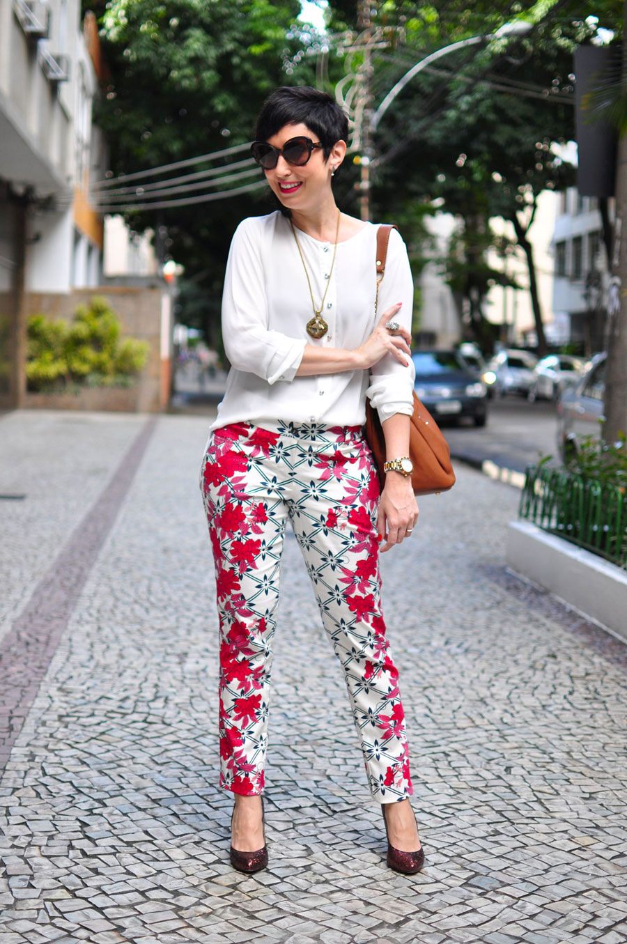 Tá banaca o look! a calça floral com a camisa branca ornou.Só não curto o salto,+tá bonita a produção.