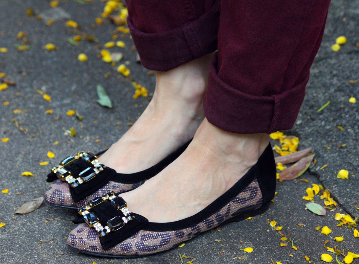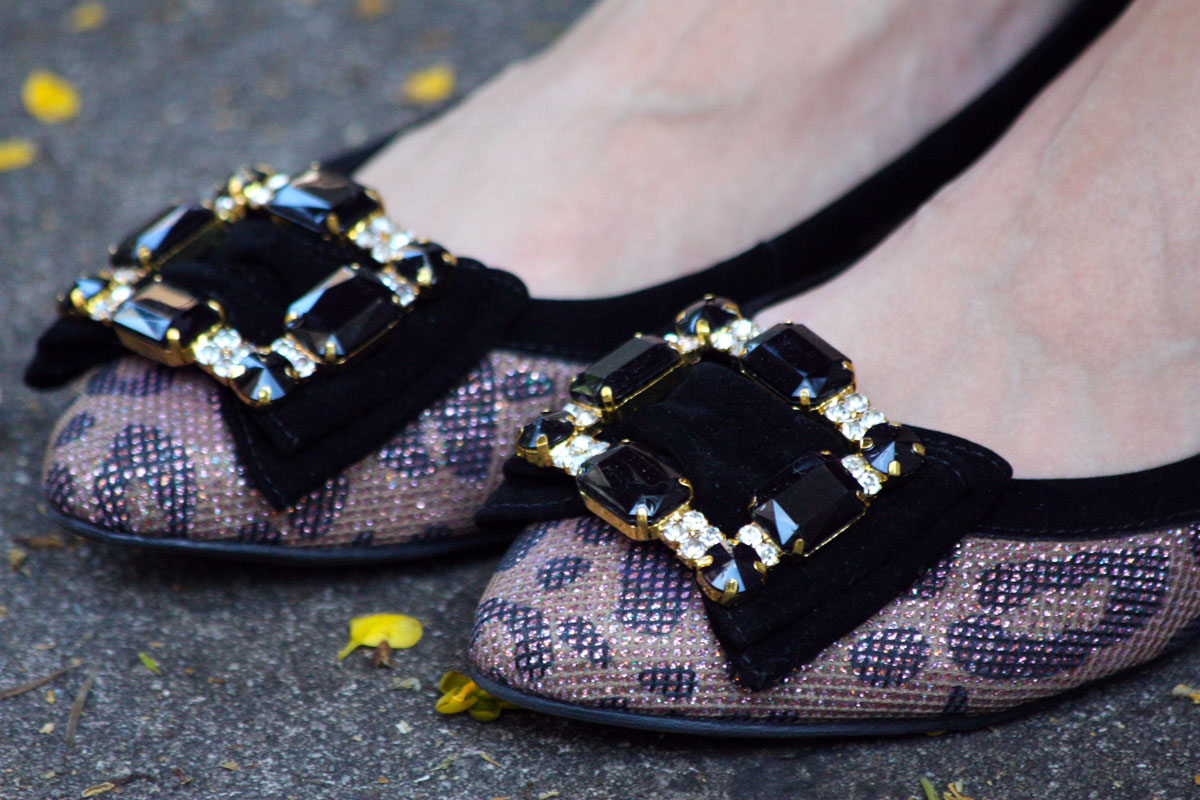 Estou numa fase de descoberta dos saltos altos, mas sempre serei do time das flats! Nada como ter conforto e ainda assim se manter elegante. Por isso morri demais de amores pela sapatilha. Taí uma de encher os olhos e fazer bonito em qualquer ocasião, além de ser super confortável, de verdade. Adorei a estampa de oncinha, com brilhos e ainda com essa aplicação em pedraria, que coisa rhyca! Outro ponto a favo1234ato de ser bico fino, sempre acho que esses modelos deixam o visual mais classudo. Transformei a minha calça em um modelo mais cigarrete dobrando bem e deixando o ossinho do tornozelo à mostra, tenho usado bastante esse truque com sapatilhas, acho que ajuda a alongar a silhueta!