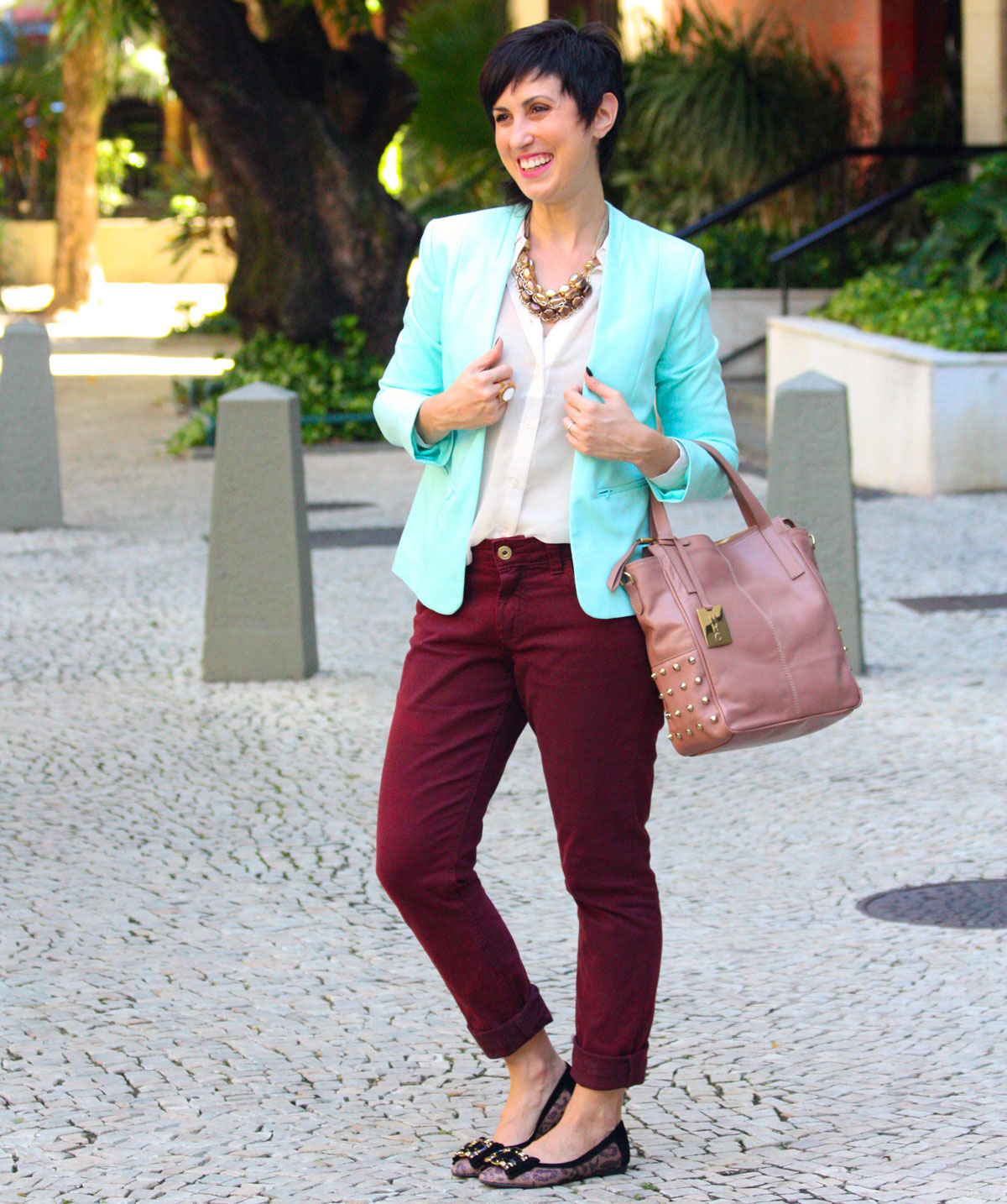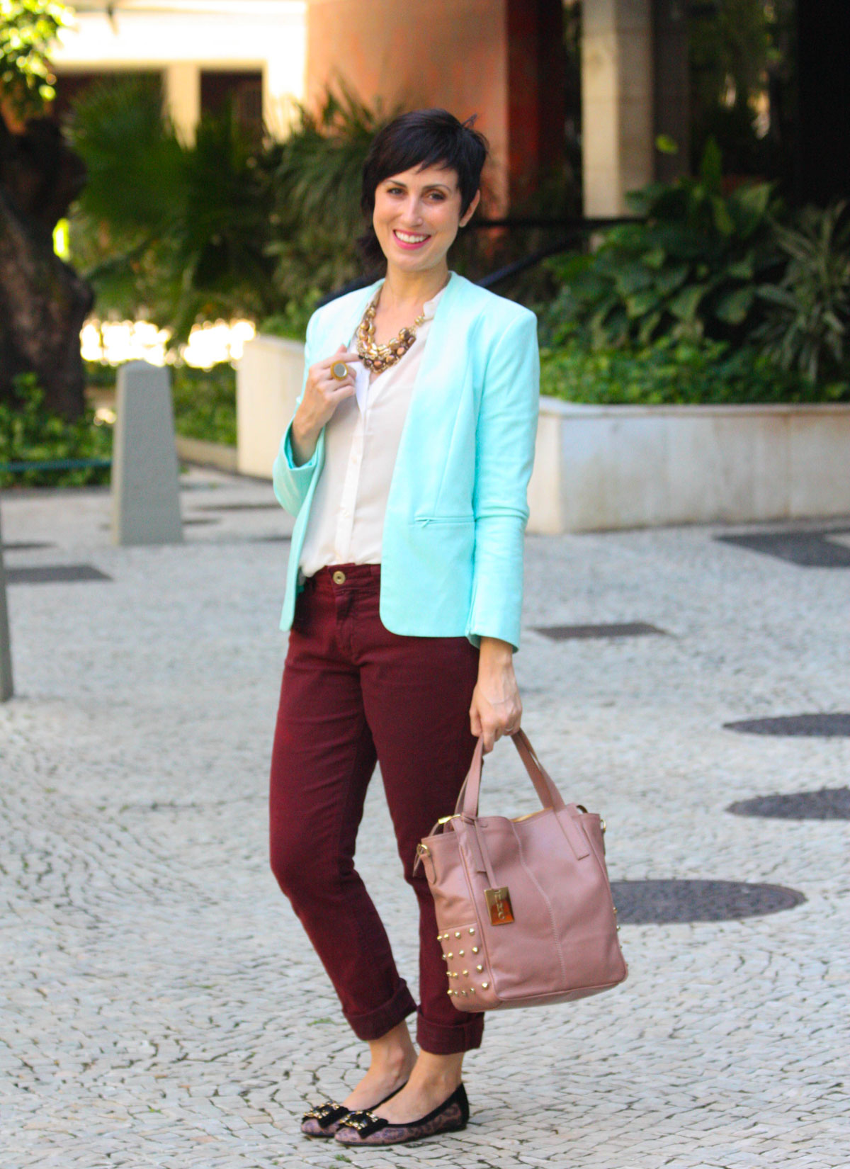 Quando eu recebi as sapatilha1234olsa pro post da NHC Shoes dessa semana, imediatamente pensei em um look preto e branco. Na hora de colocar a ideia em prática, eu não curti, achei meio óbvio, que faltava alguma cor…troquei a calça preta pela borgonha, o blazer cinza pelo colorido e voilá! Uma mistura de cores que encheu meus olhos: vinho, rosé e menta (ok, ele é mais azul que verde-menta em si, mas eu adoro fingir que ele é menta, rs)! 🙂