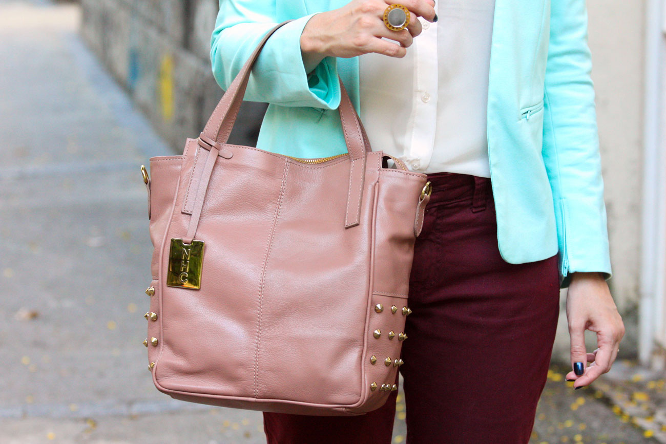 Essa bolsa da NHC tem em várias cores, mas escolhi esse rosé para testar um neutro diferente, que não seja apenas marrom ou preto! O bom desse modelito é que também é mais clássico, mas com um toque moderninho dos spikes. Ela tem um tamanho perfeito para o trabalho e depois emendar em um shopping ou happy hour. 😉 E é de couro mesmo, o que a faz ser um excelente custo-benefício!