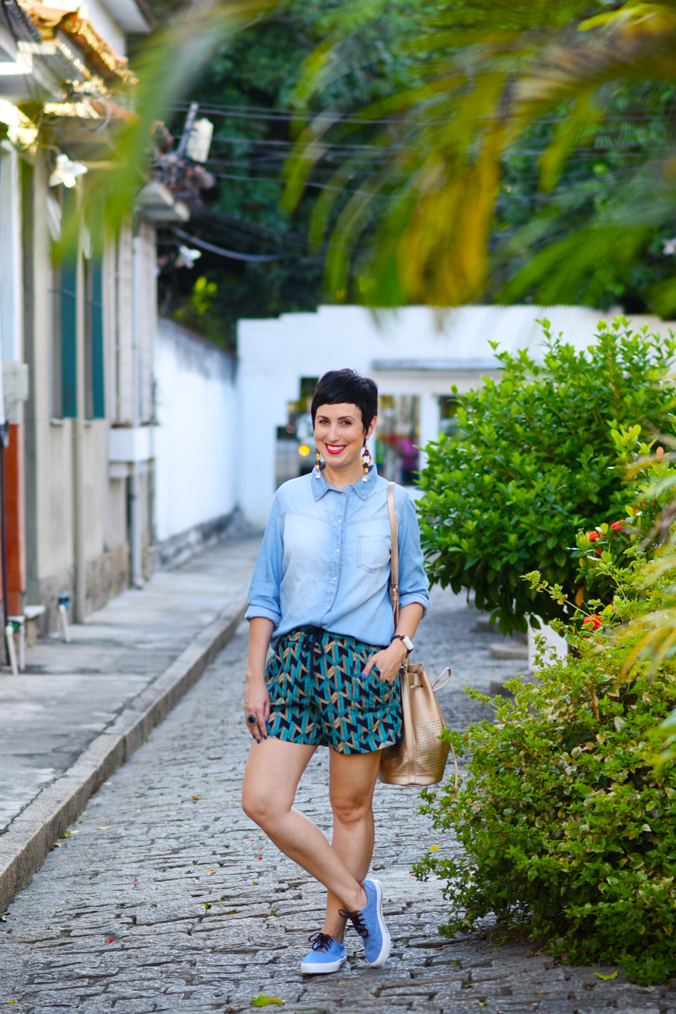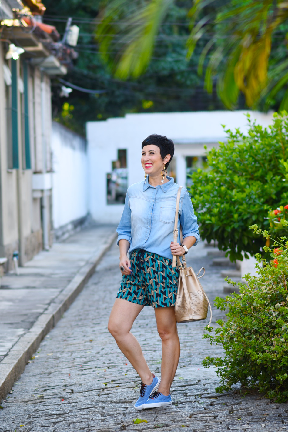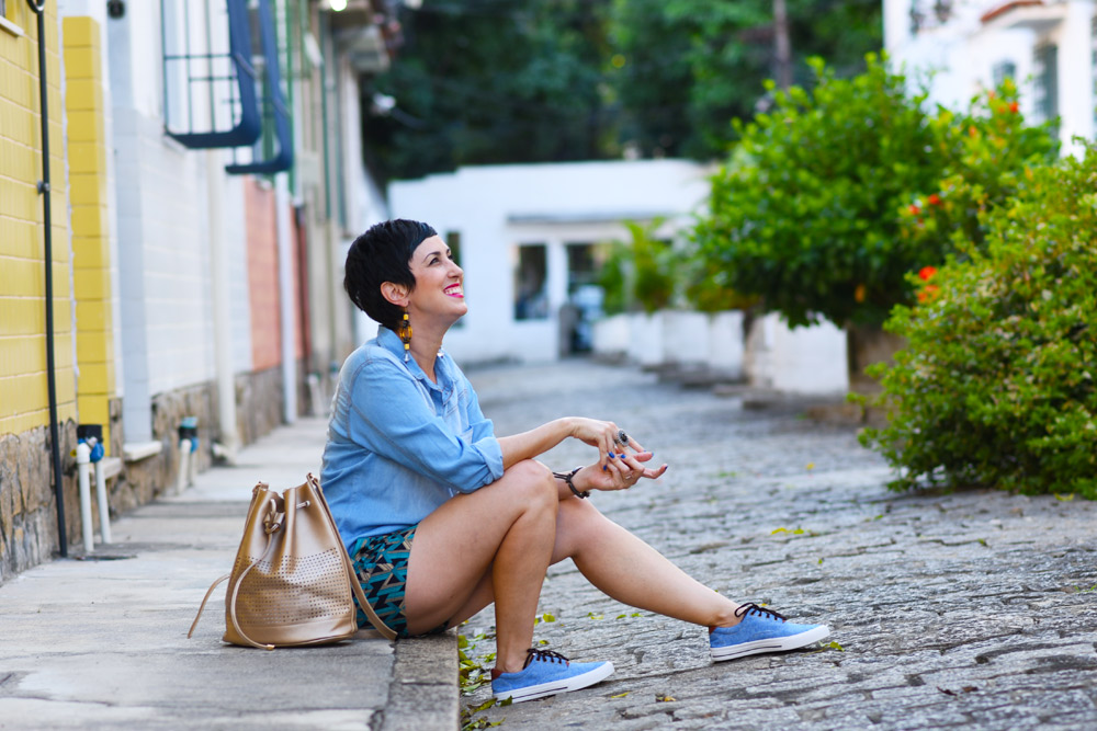 Funciona assim: se eu tenho um short bem levinho, bom pra um final de semana, mas quero aproveitá-lo durante os compromissos da semana, eu coloco uma peça mais arrumada com ele, como camisas de botão. Pra não ficar algo muito distante entre as peças, eu escolho uma camisa despojada, como a jeans. E pronto! Funciona e equilibra as mensagens de estilo. 🙂