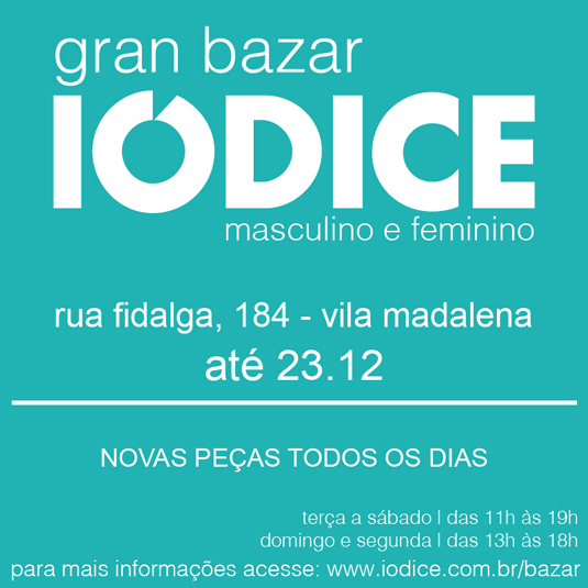 Ê lerê! Definitivamente, dezembr1234poca do ano para bazares! Recebi tantos que achei bacana divulgar pra vocês. Quem sabe alguém aproveita e faz as suas comprinhas de natal com desconto? Ah! E ainda vai ter a oportunidade de todo mundo ajudar quem precisa: Bazar Iódice Data: de 08 a 23 de dezembro Rua Fidalga, 184 – […]
