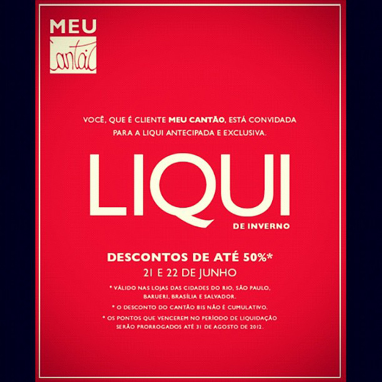 Clientes da Cantão tem venda especial até hoje nas lojas selecionadas (leiam imagem abaixo!) A Karamello Rio começou sua liquidação também: A Leeloo iniciou sua liquidação com peças selecionadas até 50% OFF A C&A também está com vários descontos de até 60% em todas as lojas do Brasil A Eclectic também não ficou atrás e […]