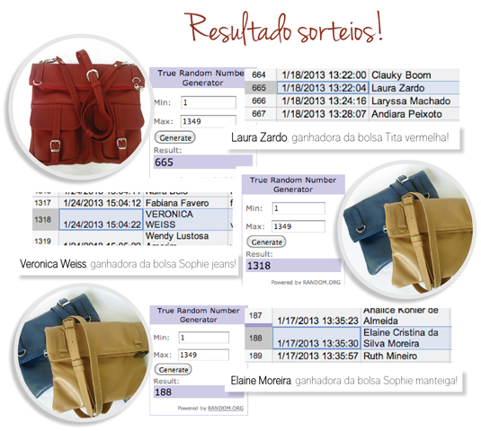 Pois é, a ganhadora da bolsa Tita vermelha do OArtífice não apareceu e como já tem uma semana do sorteio, realizamos um novo! Vamos à nova ganhadora! Parabéns, Carolina Marinho! Vamos entrar em contato com você, fica de olho no seu email! 😀