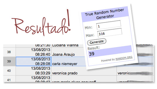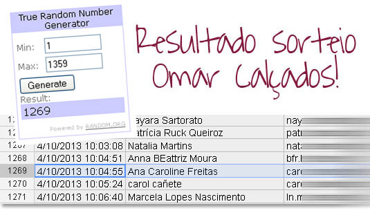 Vamos ao resultado do sorteio do vale-compras de 200,00 pra uma sortuda gastar no site da Omar Calçados? O sorteio foi feito através do Random.org que escolhe um número aleatoriamente. Tcharammmmmmmmmmm!! E a vencedora é: Parabéns, Ana Caroline Freitas!! 😀 Vamos mandar um email pra você, sua sortuda! Obrigada a todos que participaram! 🙂 Beijos!